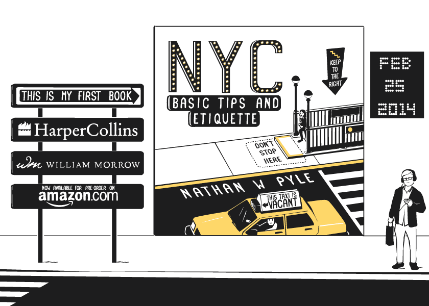 Today I get to announce that a couple of months ago, Harper Collins called me to offer me my first illustrated book deal! (William Morrow imprint) I'm thankful to all of you. You shared my artwork and have encouraged me for years. And thankful to God for this unique opportunity. LINKS: Pre-order for the February 25, 2014 release http://www.amazon.com/dp/0062303112 and FB page https://www.facebook.com/NYCBASICTIPSANDETIQUETTE and I finally joined instagram too http://instagram.com/nathanwpyle and here's the post that started it all: http://imgur.com/a/rEj7m